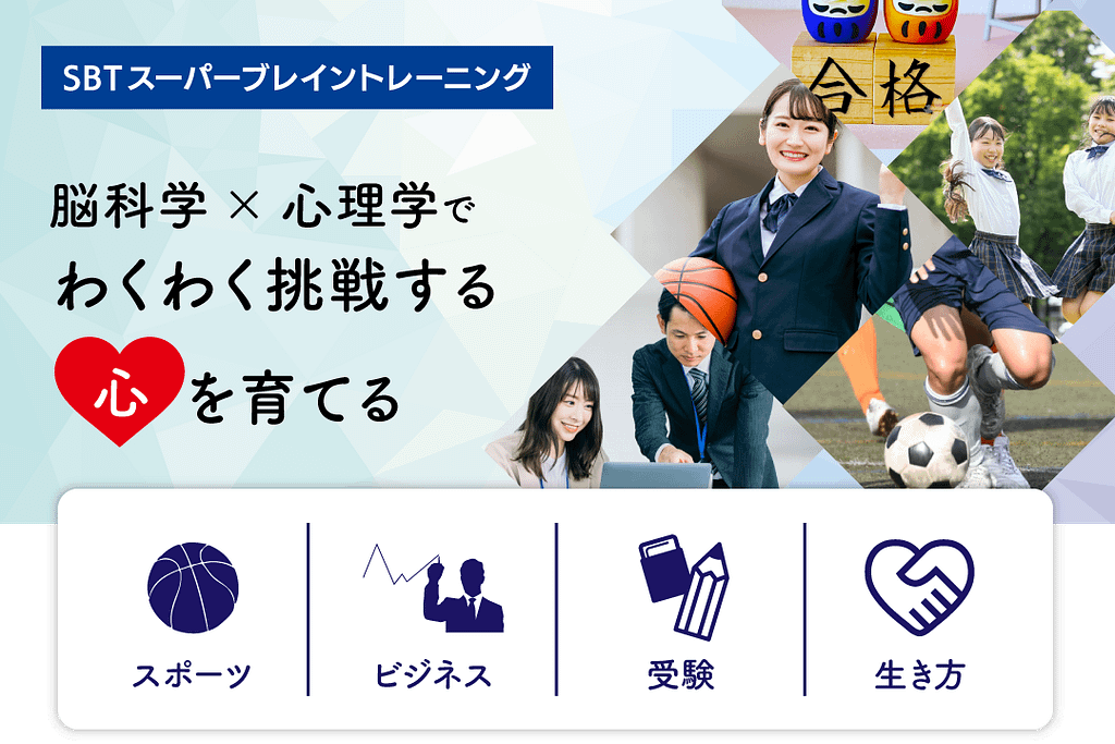 SBTは、スポーツ、受験、ビジネス、日常の人間関係など、さまざまな場面で前向きに挑戦し、目標に向かって進むための「心の土台づくり」をサポートします。